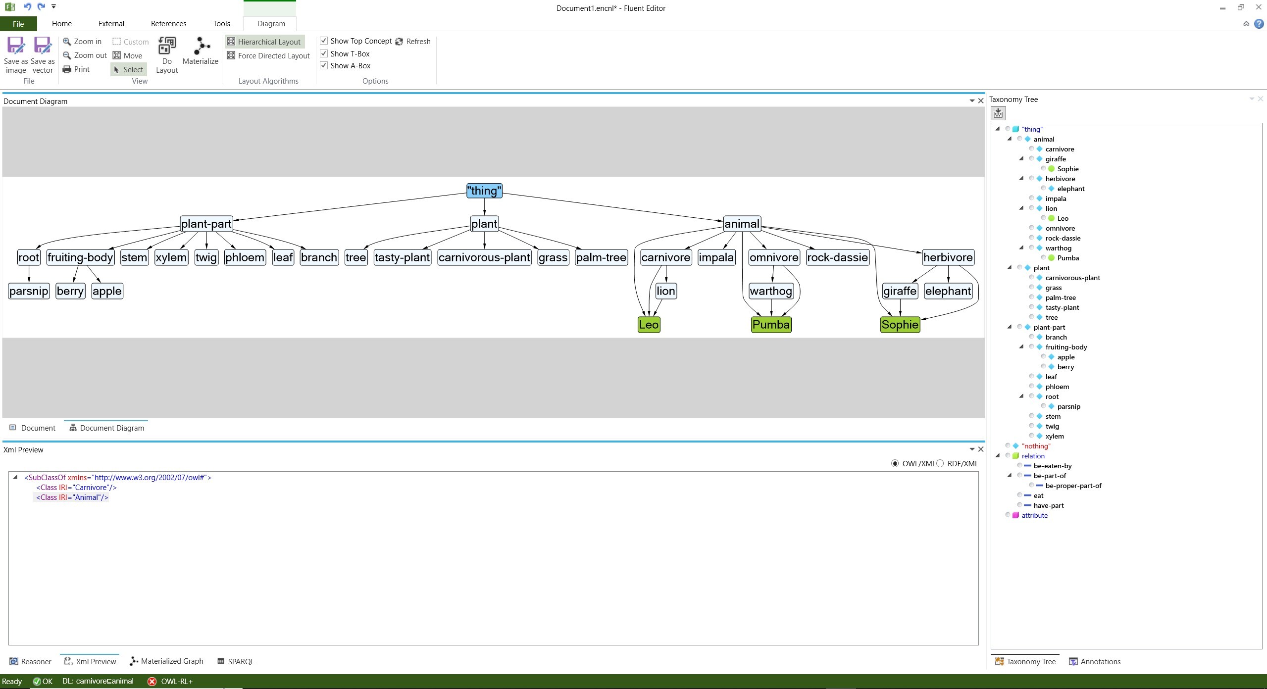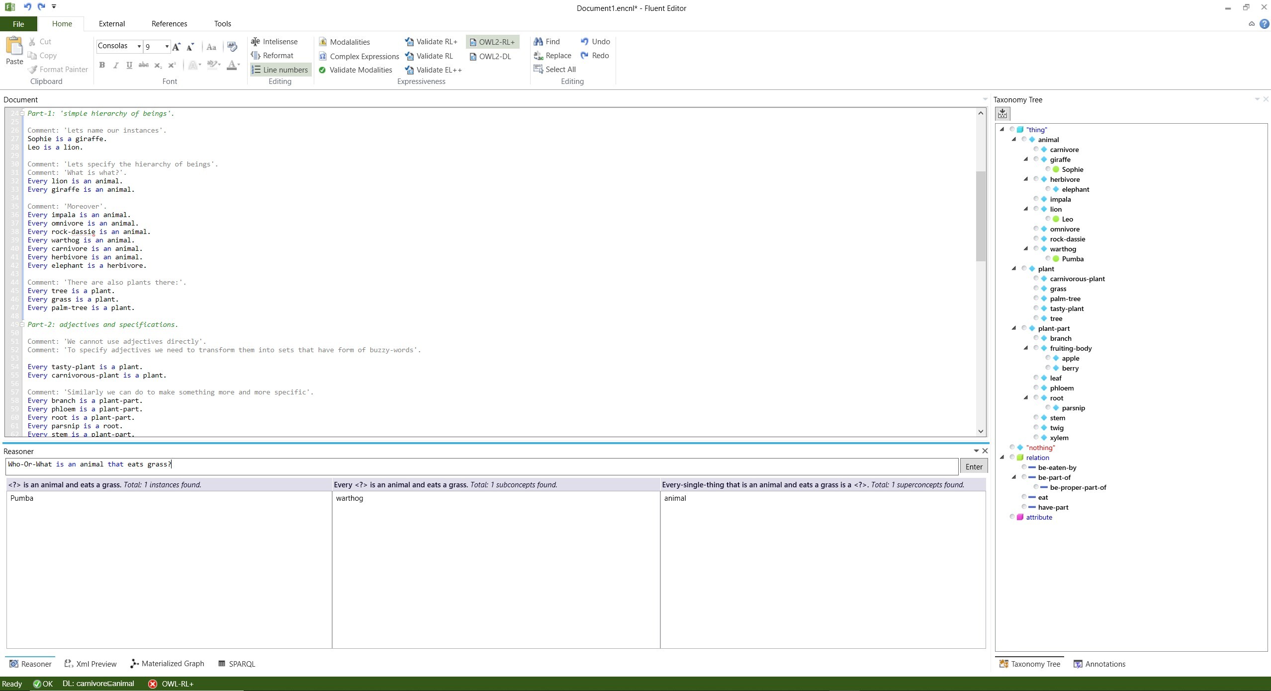 Since the tool is OWL compatible (OWL 2, OWL-DL, OWL-RL, SWRL, SPARQL, RDF, OCNL), all OWL compatible products are also compatible with FluentEditor. It’s integrated with Protégé and allows сollaboratively editing ontologies within the team and connecting directly to the server.